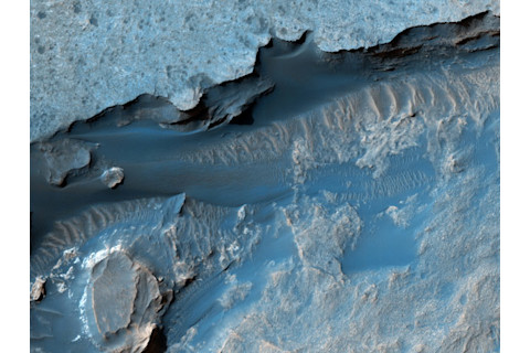 This image shows the very lower left of the oblique view shown above. It's upside-down, making features difficult to compare (check out the full HiRISE image of the area to see the whole thing), but the crater floor is at the top of this false-color image, and the mound begins to rise toward the bottom. You can see the canyon carved right into the floor, with sand dunes rippling across it. Whatever carved this canyon, perhaps hundreds of millions of years ago, perhaps more, tore away the deposited material and revealed all those layers of rock. These layers can be read like a history book written in reverse chronological order, showing us the deep past of Mars, and telling the sad tale of how an entire planet lost its water. Mars was once more like the Earth is now, though just how much is anyone's guess at the moment. I doubt it was exactly like Earth; the evidence of water we see indicates it was incredibly salty, far saltier than we have here at home. But still, Mars is a brilliant ochre cautionary tale in our sky. There but for the grace of water go we...