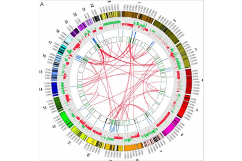 Round the outer ring are shown the 23 chromosomes of the human genome. The lines in blue, in the third ring, show internal rearrangements, in which a stretch of DNA has been moved from one site to another within the same chromosome. The red lines, in the bull's eye, designate switches of DNA from one chromosome to another.
