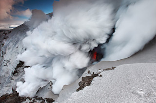This is a steam cloud that formed as the lava from the recent volcanic eruption in Iceland flows into steep canyons partly filled with deep snow and ice. Occasional explosions also occur as steam gets trapped under hardened lava, and can make things pretty hairy for anyone nearby, as Icelandic photographer Örvar Atli Þorgeirsson found out first hand as he and friends spent ten hours on the scene.