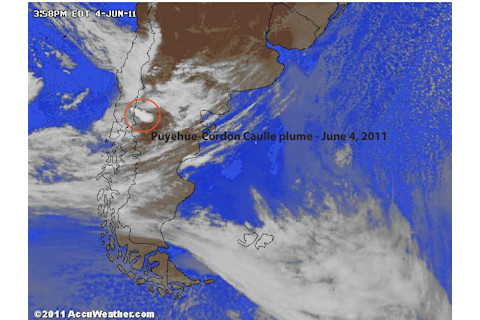 NASA Aqua image of the Puyehue-Cordón Caulle plume on June 4, 2011.