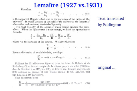 However -- Lemaitre didn't have very good data (and what he did was partly from Hubble, I gather). And for whatever reason, he did not plot velocity vs. distance. Instead, he seems to have taken the average velocity (which was known since the work of Vesto Slipher to be nonzero) and divided by some estimated average distance! If Hubble's Law -- the linear relation between velocity and distance -- is true, that will correctly get you Hubble's constant, but it's definitely not enough to establish Hubble's Law. If you have derived the law theoretically from the principles of general relativity applied to an expanding universe, and are convinced you are correct, maybe all you care about is fixing the value of the one free parameter in your model. But I think it's still correct to say that credit for Hubble's Law goes to Hubble -- although it's equally correct to remind people of the crucial role that Lemaitre played in the development of modern cosmology. Further update: Albert has now sent me more snippets from Lemaitre's original paper (one, two, three), and the English translation. (All jpg images.)