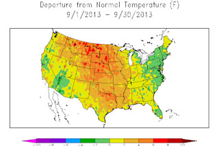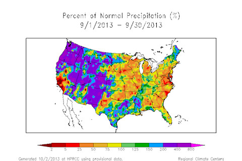Source: National Climatic Data Center Thanks to precipitation that in large parts of the West exceeded 200 percent of normal, September ranked as the 12th wettest on record, according to the NCDC. The Front Range of Colorado made it's own special contribution. Look closely at Colorado on the map and you can see a pinprick of magenta color showing an area centered on Boulder where rainfall exceeded 800 percent of average. In fact, as has been widely reported, parts of the Front Range near Boulder received more than a year's worth of rain in just a few days during September. We're still grappling with the aftermath of the resulting floods, including a possible toxic legacy left behind as the flood waters receded.