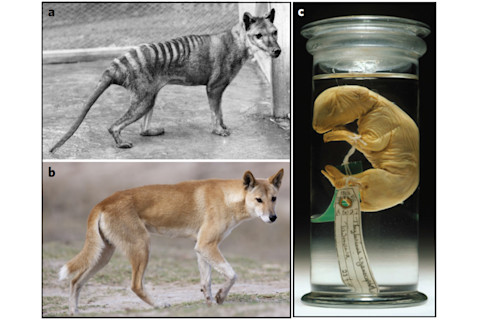 The thylacine (a) was similar in general appearance to the dingo (b) (which likely played a significant role in the former's demise from the Australian mainland 3,000 years ago). Today's study sampled DNA from a "pouch young" thylacine that was preserved in alcohol for more than a century (c). (Credit: Feigin et al, 2017, doi: 10.1038/s41559-017-0417-y) What the team found was that the species apparently experienced a sharp tumble in genetic diversity during a period 70,000-120,000 years ago. The timing coincides with a general climatic big chill. The finding hints that the thylacine underwent some kind of significant reduction in numbers that caused genetic diversity to drop. It appears that the thylacines never quite recovered genetically. Low genetic diversity isn't always a crisis, but it's never good news for a species. The lower the diversity, the less chance a species can adapt to changes in its environment, from novel pathogens to climate shifts. Right now, for example, the thylacine's nearest living relative, the Tasmanian Devil, is experiencing a precipitous decline due to individuals' susceptibility to a facial tumor disease — a susceptibility directly linked to the species' low genetic diversity. It's possible that the low genetic diversity discovered in today's study made it tougher for the thylacine as a species to survive in the face of new threats such as humans, dingos and new diseases entering its environment. The animal appears to have been already imperiled, genetically speaking, before those foreign threats arrived. At the same time, however, it's important to understand that low genetic diversity doesn't mean the population numbers never rebounded. Generally speaking, once a species undergoes a genetic bottleneck like today's study found with the thylacine, the size of the population recovers much faster than its genetic diversity. The new finding is a clue rather than a smoking gun to what may have kicked off the species' doom. Wolf v. Tiger Today's study also investigated the genetic backstory of the thylacine's extremely canid-like appearance. It's long been considered a case of convergent evolution — when two unrelated species develop similar traits independently, usually as a result of exploiting the same ecological niche. But researchers wanted to go more than skin-deep, so to speak, and figure out if the similar traits arose from the same genetic activity. The researchers compared the thylacine genome with an ancient canid genome they reconstructed from five living canid genomes, including that of a wolf, jackal, coyote, red fox and arctic fox. And surprise: It turns out that natural selection operated on different genes and genetic pathways in the canids than in the thylacines. It's a stunning illustration of how organisms can take different routes to arrive at the same destination, at least in terms of physical appearance. Today's research was published as open-access in Nature Ecology & Evolution.