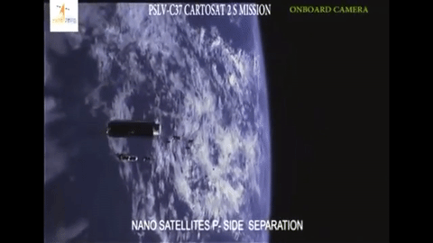 An Indian rocket delivered a record-setting 104 satellites into orbit Tuesday night. A camera on board the Polar Satellite Launch Vehicle captured the spacecraft, most of them tiny CubeSats, as they tumbled into orbit—the most placed into orbit by a single vehicle. A majority of the satellites belong to a U.S.-based company called Planet which hopes to establish a network of tiny satellites to provide near-real-time imaging of Earth. https://www.youtube.com/watch?v=c0BpjPUT5FE An Indian cartography satellite and two experimental nanosatellites, weather-monitoring CubeSats and student-built experimental craft were also on board. The 101 CubeSats took flight shortly after the rocket entered orbit in a carefully orchestrated maneuver involving 25 "Quadpacks." Packed with four tiny probes apiece, the Quadpacks used a spring-assisted delivery system to eject the probes into orbit two at a time. The 88 satellites from Planet, called Doves, will join 12 others already in orbit to form a string of small imaging probes that completely encircles the globe. Placed in a Sun-synchronous orbit that reaches from pole to pole, their network should allow them to take pictures of Earth multiple times an hour once they are all in place. And, because their orbit takes them over the same place every day, it allows for day-by-day comparisons of specific areas. The company says that with this launch they are operating the largest fleet of satellites ever assembled. The CubeSats they use are only about a foot long, and are often utilized as a low-cost way of testing preliminary technologies and running experiments. The satellites are small enough that they can often squeeze onto launches as secondary payloads, allowing for cheaper rides into orbit.