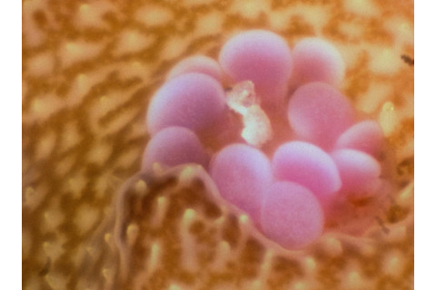 An image of a coral polyp acquired using BUM's 3x objective lens. (Credit: Andrew Mullen) Harmful algae soon move in and smother the coral polyps, eventually killing them. The researchers watched this process unfold in real time at the microscopic level. They noticed a pattern to the algae assault: It forms on the ridges between polyps, leaving the essential structures themselves alone. In time, they overwhelm corals entirely, leading to death. The researchers hope documenting coral death in such detail will reveal new ways to combat harmful algae growth.