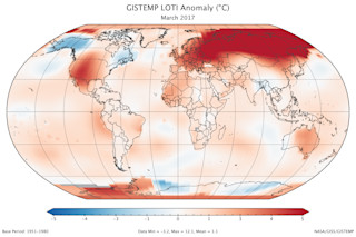 This map shows how temperatures varied from the long-term mean in March 2017. Europe and all of Russia were again much warmer than the 1951-1980 base period. Much of the United States was also relatively warm, but Alaska was cool. (Source: NASA GISS) The home planet just experienced its second warmest March on record, according to an analysis released by NASA last week. The agency's temperature records go all the way back to 1880 From the analysis: