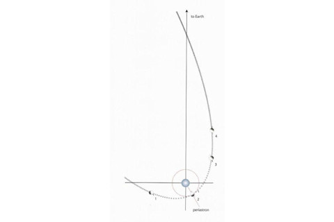 The planet has pulled away as far from the star as it can, but gravity cannot be denied. Slowly, inexorably, it begins the long fall back. Growing ever-larger as the planet draws ever-nearer, the star swells hugely. Just 55 days after reaching its farthest distance from the star, the planet drops hellishly close to the star's surface, and a furnace blast of heat bears down on it. The planet's atmosphere roils and churns, reaching temperatures hot enough to melt copper. Accelerated by the star's gravity to a speed hundreds of times faster than a rifle bullet, the planet whips around the star and begins the long climb back. It will cool down as it puts over 100 million kilometers between itself and the fierce light of the star... but the cycle will repeat itself, and the planet will burn once again.