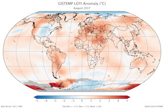 A global map from NASA of how Earth's surface temperatures last month departed from the 1951-1980 August average. (Source: NASA GISTEMP. Note: part of Antarctica is gray because data from some stations there were not yet available at the time of this analysis.) Last month was among the very warmest on record, according to two new analyses – and the heat is very likely to continue. With less than four months left to go in 2017, the year will probably come in as second or third warmest on record. Two agencies have produced very slightly different verdicts for this past August. NASA's Goddard Institute for Space Studies has found that last month was the second warmest August globally in 137 years of modern record-keeping, surpassed only by August 2016. Global temperatures last year received an extra boost from a strong El Niño episode. Meanwhile, NOAA's National Centers for Environmental Information found that last month was third warmest, behind August 2016, which was first warmest, and August 2015, second warmest.