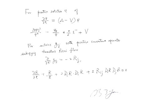 Mathematical truths have a uniquely austere beauty in their own right, but the visual presentation of such results in the form of equations can be striking even if the concepts being expressed aren't immediately accessible. (Yau is talking about Ricci Flow, a crucial element in the recent proof of the Poincare Conjecture.) Meanwhile, many of the entries take the form of metaphorical pseudo-equations, using the symbols of mathematics to express a fundamentally non-quantitative opinion (Jonathan Haidt, Linda Stone). Some of the entries are dryly LaTeXed up (David Deutsch), some are hastily scribbled (Rudy Rucker), some tell fun little stories (George Dyson), and some are painstakingly elaborate constructions (Brian Eno). Several aren't equations at all, but take the form of flowcharts or other representations of processes, such as this from Irene Pepperberg: