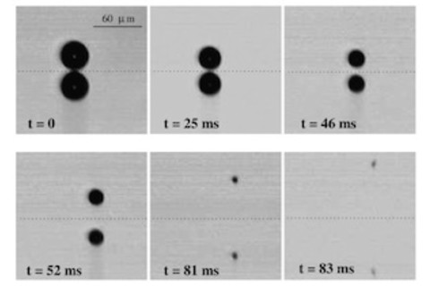 a model of the forces at work in the Leidenfrost effect, and then compared their theoretical work to high-speed films of water and ethanol droplets on a heated surface. The researchers observed that the water typically fell to the surface, bounced, and then sat comfortably cushioned by its vapor coat, with the upward push of the vapor beneath it balanced by the weight of the droplet. But as the droplet slowly evaporated, its vapor coat actually grew thicker, until the force exerted by the vapor exceeded that of the drop, and the underlying vapor layer shoved the droplet into the air. For ethanol, which boils at a lower temperature than water, droplets didn’t even have a chance to bounce before the vapor propelled them up, up, and away. [via the American Physical Society