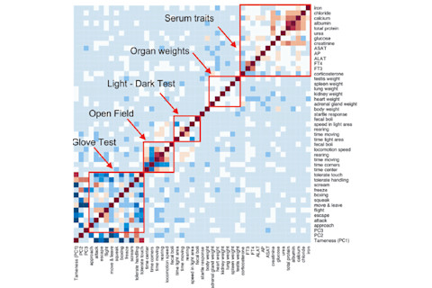 The basic outline was that the original rat population was separated into two breeding programs. Two lines were developed which exhibited opposite tales of the distribution in "tameness." They did truncation selection to shift the median trait value of the population over the generations, but eventually the populations stopped responding to selection. Why? Probably because the underlying standing genetic variation which they were drawing from was exhausted. The ability to recreate different cat and dog morphologies from extant variation suggests that novel mutations aren't necessary to drive this sort of quantitative trait evolution. Nevertheless after a number of generations trait value stopped changing because the underlying allele frequencies had been driven to fixation (likely in disjoint frequencies between the two populations in question). At this point the researchers noted which regions exhibited the greatest allele frequency differences, and genotyped them in a subsequent linkage study. The two lines which were the products of selection, the "tame" and "aggressive" populations, were crossed to produced hybrids, and the hybrids themselves were crossed. The results were what one would expect, as the hybrids (F1) exhibit midparent values and the variation of the original parent populations reappeared in the third generation (F2). In addition to the wide range of phenotypes in addition to tameness that they looked at, they were curious about correlations. Here is a chart which illustrates the associations (or lack of):