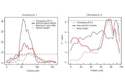 Two significant QTL for tameness...The strongest of these (termed ''Tame-1'') is located at 58 cM on chromosome 1. The difference in tameness between homozygous genotypes at Tame-1 corresponds to 20% of the difference between the tame and the aggressive line (1.2 of 6.4 units of PC1). Tame-1 explains .1% of the phenotypic variance in tameness. The second locus (''Tame-2'') is located at 78 cM on chromosome 8. Both the tameness difference between homozygous genotypes (10% of the line difference) and the portion of residual phenotypic variance in tameness it explains (2.3%, are about half of those of Tame-1.
