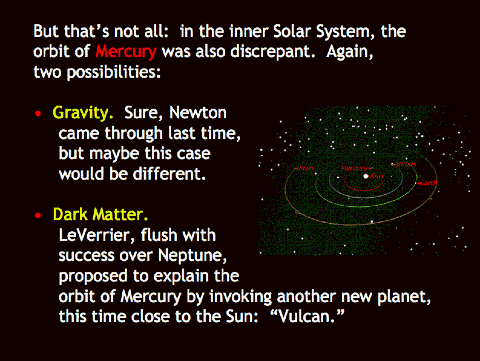 To bring things down to earth (relatively speaking), most of the talk consisted of an extended look at the battle between "dark matter" and "modified gravity." It goes all the way back to Leverrier and the discovery of Neptune, whose existence was inferred via its gravitational tug on the orbit of Uranus. Neptune was the first successful prediction of dark matter -- some unseen substance whose existence is revealed by its gravitational influence. Leverrier tried again with the similarly-discrepant orbit of Mercury, positing a planet called Vulcan; but this time it turned out that gravity itself was the culprit, after Einstein showed that general relativity correctly accounted for the precession of Mercury's orbit. So the lesson from history is -- different ideas work in different circumstances. Keep an open mind until the data come down on one side or another. (And once they do, admit it.) Today, of course, we're dealing with an analogous problem, given that 25% of the universe is apparently some kind of dark matter that doesn't fit into the Standard Model of particle physics, and 70% is some kind of dark energy that is even more mysterious. Modified gravity might be at work here as well, and I talked about the prospects. Along the way, I drew out some of the lessons about how science works that these various investigations have taught us. I intentionally did not try to wrap it all up with a neat bow into a catch-all philosophy of science, as I think the reality is kind of messy, and it's worth admitting that. The closest I came was the famous quote from Professor Rumsfeld, previously shared. This led to a series of cautionary homilies warning against misuse of the hypothesis-testing nature of scientific inquiry. The truth is, scientific knowledge is inevitably tentative, not metaphysically certain. But that doesn't mean that anything goes -- some things we really do understand! So I cautioned against various mistakes, using perpetual-motion machines, Intelligent Design, and What the Bleep Do We Know as good examples of what not to do.
