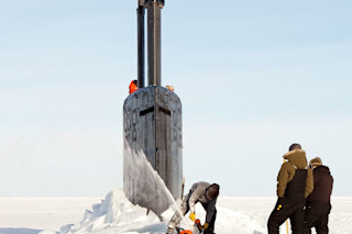 Locating subs in the Arctic is difficult because the jagged undersides of ice garble sonar tracking. So APL researchers brave –30 degree Fahrenheit temperatures every spring to test devices like Deep Siren, which uses satellites and acoustics to send messages through more than 100 miles of water. The weeklong experiments also increase the Navy’s visibility in the area. “The Arctic is governed by international agreements, but now that the ice is retreating it’s getting a lot more interesting,” says APL field engineer Keith Magness (observing, second from right). “Countries are trying to expand their coastline to claim resources, and this is one way the Navy maintains its presence.”