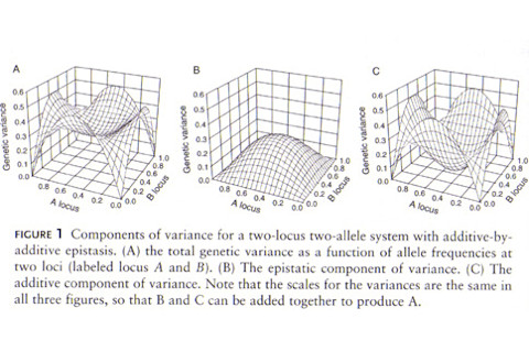 I know I've posted on this topic before, but I thought I'd revisit it again. You do know that sometimes population bottlenecks can actually result in more variation being freed up for selection? This may strike you as a bit strange; after all, the power of selection to effect phenotypic change is proportional to genetic variance, specifically, additive genetic variance. Population bottlenecks imply a reduction in effective population size, the increase of sample variance across generations, that is, random genetic drift. As population size drops the stochastic change in gene frequencies becames proportionately much greater and alleles rapidly go extinct, or fix, within populations (average time until fixations in generations is proportional to 4Ne is effective population size). The homogenizing effect of this dynamic is similar to what might occur with inbreeding, where effective population size is reduced through population substructure, and individuals within the demes quickly become closely related over a few generations. Obviously you know that inbreeding leads to a loss of variation. So how exactly can we extract more additive genetic variance from this? In short, but converting other types of variance....