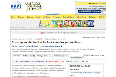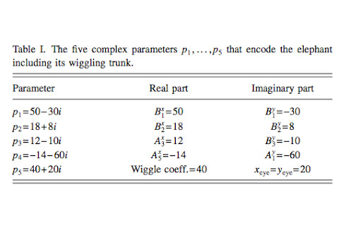 Photo: flickr/shaymus22Scientists are often mocked for their fanatical, and often obscure, obsessions. Take this study, published in the American Journal of Physics, for example. This paper describes in great detail how to draw an elephant using mathematical equations. The solution involves a series of clever tricks, a couple of Fourier series, and results in a fairly cute elephant (see below). But, you may be asking yourself, "Why an elephant?" Well, according to the authors of the study, this feat has been bandied about for a long time, but never actually achieved. "A turning point in Freeman Dyson’s life occurred during a meeting in the Spring of 1953 when Enrico Fermi criticized the complexity of Dyson’s model by quoting Johnny von Neumann: 'With four parameters I can fit an elephant, and with five I can make him wiggle his trunk.' Since then it has become a well-known saying among physicists, but nobody has successfully implemented it." Till now, that is!Drawing an elephant with four complex parameters. "We define four complex numbers representing the parameters needed to specify an elephantine shape. The real and imaginary parts of these complex numbers are the coefficients of a Fourier coordinate expansion, a powerful tool for reducing the data required to define shapes." Bonus table and quote: