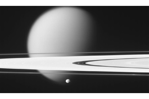Oh boy, can you imagine being able to fly along and look out of your window at this? Sigh. Those are Saturn's rings, with Titan in the background (all gassy and fuzzy looking as a result) and the "moonlet" (read: alien spacecraft in stealth mode?) Epimetheus in the front field. -cvj (Via Dean W. Armstrong and Bad Astronomy More raw images here.)