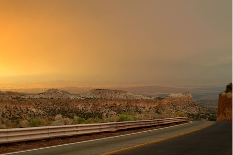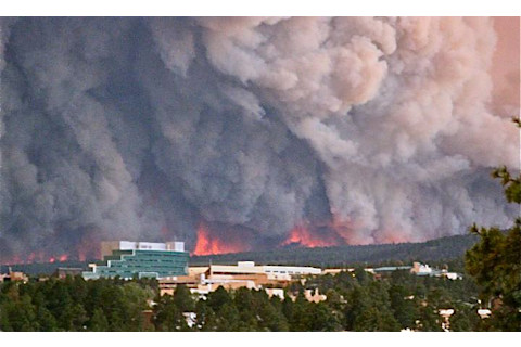 But, perhaps most importantly, it seems like fire fighters have gotten the upper hand over the last day or two, and the area around the laboratory and town seems to be relatively secure. Extensive fire breaks have been built, with back burns helping to clear out potential underbrush and ensure an appropriate buffer. And, in the latest positive development, this evening we had some fairly spectacular thunderstorms and rain. One side effect is that the smoke has completely dissipated, and from my living room (in Santa Fe) we now have a clear view across the Rio Grande valley to the Jemez mountains above Los Alamos. After two weeks of hearing about the fires, and seeing the smoke, now for the first time we can actually see the flames themselves. This came as quite a shock. It is a scary but strangely beautiful sight (from ~30 miles away).