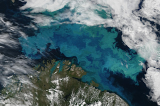 Brilliant shades of blue and green explode across the Barents Sea north of Norway and Russia in an image acquired on August 14, 2011, by NASA's Aqua satellite. The color was created by a massive bloom of phytoplankton, which is common here in August. (Source: NASA Earth Observatory) Editor's note: