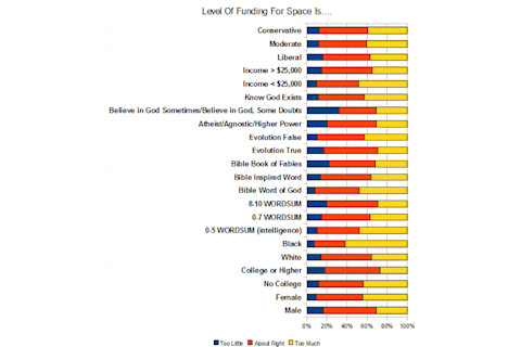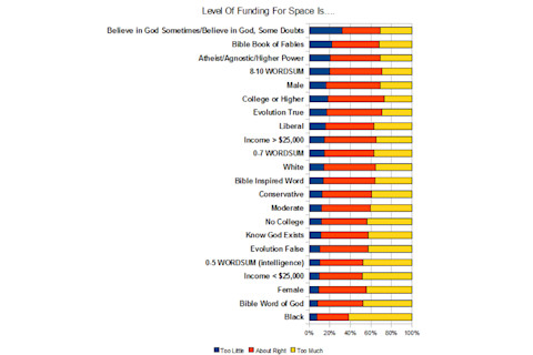 The secular, the intelligent, the educated and males exhibit inordinate support for a space program. In contrast, blacks, women, the stupid and the extreme poor (that is family income below $25,000 in the past 10 years) are skeptical of funding for the space program. I was surprised by the lack of difference in political clusters, with even a slight tilt toward liberals. I've heard the "rockets vs. butter" argument in public forums from Left-leaning individuals many times. In particular I recall as a child being annoyed at Joseph P. Kennedy for making a crass speech on the floor of the House of Representatives in this vein, suggesting that people starve on earth so that rockets may orbit above us.