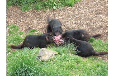 Hypercarnivore Dinnertime: Tasmanian devils enjoy some meaty fare at the Devils@Cradle sanctuary in Tasmania. Credit: G. Tarlach