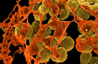 Individual microbes of the same species often have a lot of different genes. But why? (Image: NIAID) Prochlorococcus marinus are diminutive organisms. At less than a micrometer across, these photosynthesizing microbes may be small, but they’re plentiful – by many accounts one of the most abundant species on the planet. But that’s not quite the full story: like any other member of the same species, no two P. marinus individuals are genetically identical. What’s remarkable is how different they may be. Take two different P. marinus cells from different parts of the ocean, sequence their genomes, and lay them side-by-side. Of the approximately 1900 genes that each genome contains, only about 62% are likely to be shared. What makes these two individuals members of the same species is the similarity of one particular gene – the 16S rRNA gene – but the rest of the genome isn’t so consistent. This phenomenon is pervasive in the microbial world: members of the same species have a “core genome” that is invariably present. These are typically the genes that distinguish the species’ energy-generating and carbon-assimilating metabolism, such as photosynthetic pathways in P. marinus. But they also have an “accessory genome”, a collection of genes that is – by definition – different between distinct cells and could confer useful, condition-specific capabilities. Combine all of the accessory genes and the core genes and you’ve assembled the “pangenome”: the full set of genes that could potentially be in an individual. Pangenomes allow species to sample from a large grab bag of genes – they’re a “diversity generator” which, across the microbial world, has put trillions of different genes into circulation. But evolutionary biologists have struggled to explain the concept of the pangenome. If a newly acquired gene is good, then you’d expect it to be “fixed” into the core genome, allowing all members of the species to gain an advantage over competitors. If the gene is not good – bad or merely neutral – then it should be eliminated. Any gene that doesn’t contribute to an organism’s fitness is subject to energetic cost cutting – it’s simply not worth replicating a freeloading gene across generations if it’s not helpful. So why do pangenomes exist? In a new paper, James McInerney – a biologist at the University of Manchester in the UK – thinks he has an answer. The new genes are generally good, he argues, but before a new gene gets a chance to be “fixed” into the full population, the fortunate host cell migrates into a new niche. In some cases, the fate of a newly acquired gene may be dependent upon the new environment a microbe finds itself in. If it’s useful – say, an antibiotic resistence gene in a neighborhood sizzling with biochemical warfare – it gets to stay. If not, it goes. McInerney’s riff on the adaptive evolutionary model leads to some testable predictions. For example, organisms that sample a wider range of habitats, like E. coli, in billions of animal guts, should have large pangenomes. (It does, with 3,188 core genes and more than 90,000 accessory genes.) You’d also expect to see a kind of “distance-decay” function of accessory genome similarity, with individuals in the same habitat sharing much of their accessory genome and those in different niches sharing others. With this theoretical underpinning, McInerney and his coauthors “present our predicitons for future empirical observaitons.” Challenge issued, evolutionary biologists may be on the cusp of answering one of ecology’s biggest questions.