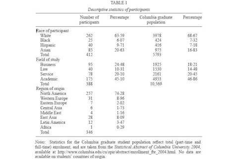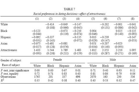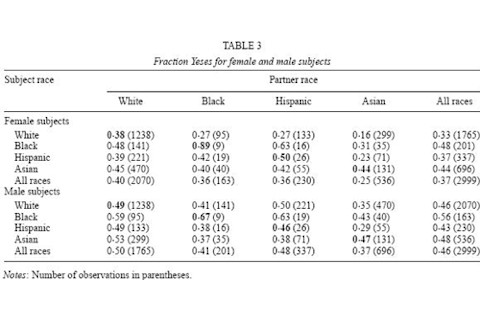 There is a difference. But the general outline remains the same. At this point the researchers decided to simplify the presentation; they pooled the other races aside from same race and clumped males and females together when trying to tease apart the determinants of racial preferences. They found in preliminary analysis that though females are much more strongly biased, males exhibit the same pattern of determinants. Since you can read the whole working paper I'll restate in plain language what they find re: determinants. If you want the exact betas just download the PDF. Here are variables which predict same race preference: High proportion wish ban on interracial marriage in a region Areas where people would not want to be neighbors with another race Areas where there are large populations of other races Here are variables which predict less same race preference: Older Attractiveness, 1 standard deviation increase in attractiveness results in a 4 point decrease in same-race preference Variables which had no effect: Shared interests Cultural variables (books read, etc.) Income There are some comments on the robustness of their findings (N for blacks isn't very large, etc.), but generally little else in the conclusion. Here's the only thing of note: