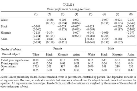 Just inspecting the table, it's pretty obvious what's going on here. Some general observations: 1) Black women at Columbia are really open to dating black men. Take a look at the sex ratios there. 2) Asian dudes are really screwed. Not only are non-Asian women not impressed, but Asian women aren't reciprocally racially discriminatory to level the playing field. 3) Women care a lot more about race than men. Though there is some variation in the male acceptances by race, but as I said most of the differences were not statistically significant. To make this concrete, black women were three times as likely to say yes to a black man as they were to an Asian man (though white women were the most repulsed by Asian men clearly). That's pretty simple. Here's the nitty-gritty on their model. This is their first linear equation: Decisionij = αi +β1Blackj +β2Hispanicj +β3Asianj +εij, i = subject and j = partner, so this is the decision of the subject in relation to the partner. Here's the table which lays it out: