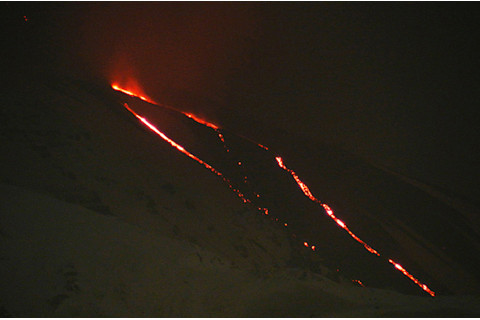 Lava flows on Mt. Etna seen on February 21, 2013. Even from this vantage, the thickened crust on the lava flows is evident as the narrow flows move downslope. Image: Dr. Boris Behncke / Flickr. Apparently this video was taken by "lava artists" during some recent activity at Mt. Etna. Lava flows from Etna can travel far downslope in channels, forming thick crusts that could support a person -- as they did here. However, as we know, many eruptions at Etna are much more explosive in their character (at least at first) and lava flows tend to follow or occur simultaneously with these paroxysms. So, running up a lava flow is possible without much in the way of dire consequences if you (a) pick the right lava flow -- cool and slow; (b) you step lively and (c) get lucky. This hobby is up there with base jumping from tall buildings and surfing a volcano in terms of smart ways to spend your time, but really, lava flows are some of the least dangerous (to people) of the hazards from a volcano.