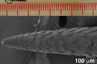 Reference: Cho, Ankrum, Guo, Chester, Yang, Kashyap, Campbell, Wood, Rijal, Karnik, Langer & Karp. 2012. Microstructured barbs on the North American porcupine quill enable easy tissue penetration and difficult removal. PNAS http://dx.doi.org/10.1073/pnas.1216441109