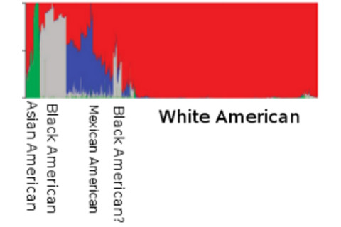 The chart to the left shows how race is a social construct. It's a bar plot which partitions ancestry, and as you can see, the Asian children are a mix of European and Asian. How does that happen? Because in 1980 the US Census included people of South Asian origin as "Asian Americans." In contrast, those of Middle Eastern origin remain "non-Hispanic white" (this not totally crazy, think Ralph Nader or Marlo Thomas). But it means that an ethnic Baloch from Pakistan is "Asian," and an ethnic Baloch from Iran is a "non-Hispanic white." Only a government bureaucrat would be happy with this situation. Obvious more fine-grained genomic analyses are necessary at least to force us to acknowledge the stupidity of these bureaucratic quirks. I am chagrined to realize that I've put "Asian" as my race quite often on medical related forms (or, my parents have done so), when the reality is that my genetic background is very distinctive from someone who is from East Asia (and, West Asia). But, this more detailed look at a genomic sequence does not necessarily obviate the need for higher level categories, such as race. One might conceive of a genotype as conferring a set of transparent risks contingent upon a particular variant at a specific location. But by and large we've run into limits in this endeavor. And even when we know much more, there will likely be subtle interactions and networks which will simply not fall out of a raw sequence. That's because populations have histories, and their identity as members of a population is telling you something about that aggregate history. That history shapes a "genetic background," the sum total of genotypes across the genome, in which a specific genetic variant expresses itself. For example, the ancestors of Amerindians were isolated from the populations of Eurasia, Africa, and Oceania, for at least 10,000 years. Their genomes today are then the outcome in part of this particular special history. When genomics becomes like physics (or perhaps more accurately the physics of linear systems?) history will not matter. Until then, history will matter. Classification will matter. More generally, that is why taxonomy matters in biology so much. Phylogenetic relationships are "information for free."