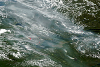 Smoke plumes are visible from multiple wildfires burning in the Northern Territories in this image captured by NASA's Terra Satellite this afternoon. (Click to enlarge.) Red dots mark places where the satellite detected fire. The Great Slave Lake is visible toward the bottom portion of the image. (Source: NASA) More often than not, the morning light I wake up to here in Colorado is pure, brilliant, even sharp. But for the past two mornings, the morning light has reminded me of Los Angeles in October — soft, yellow-golden in color, clearly filtered through a scrim of something suspended in the air. This is usually a sign that a wildfire is burning somewhere relatively nearby. So on both mornings I stepped out onto my deck and sniffed the air. Nothing. But it turns out that smoke has indeed been filtering the light here — and across a significant portion of both Canada and the United States.