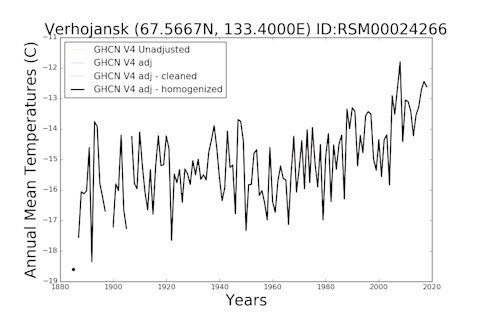 The annual mean temperature trend from data recorded at a weather station in the same region of Siberia as the Batagaika Crater. Temperatures have been rising since the late 1960s. (Credit: NASA GISS)