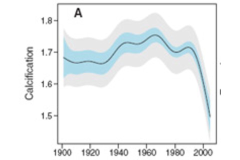 Reference: G. De'ath, J. M. Lough, K. E. Fabricius (2009). Declining Coral Calcification on the Great Barrier Reef Science, 323 (5910), 116-119 DOI: 10.1126/science.1165283