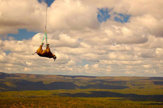 Black rhinos are bulky, earthbound animals---but lately, the lumbering pachyderms have taken part in some pretty impressive aerial acrobatics. Nineteen of the endangered rhinos have taken thousand-mile trips across South Africa while dangling upside down from helicopters. The WWF's Black Rhino Range Expansion Project was moving the animals away from poachers and into larger, safer habitats. The safest, shortest mode of transport, in a region with bumpy roads and no jet-ready runways, turns out to be suspending tranquilized, blindfolded rhinos by the ankles from a chopper---Mafia-style. You can watch the rhinos flying through the air (and hear more about the project) in this video: Next up: skydiving elephants? [via New Scientist]