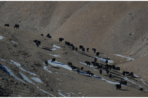 It's hard for humans to tell what wild yaks are doing up there. Living high in the Tibetan Plateau, the rare ungulates are not easy to find. When scientists managed to track some down, they saw that females are hanging out in huge groups with no males allowed. And, though no one knows why, the females prefer habitat that's higher and steeper than where the boys play. Currently rebounding from poaching, wild yaks—which, male and female, look a bit like bison wearing skirts—are still endangered. Yet without knowing much about where or how yaks live, conservationists can't be sure of the best ways to protect them. So University of Montana biologist Joel Berger and his colleagues traveled to Tibet in late 2012 and went looking for yaks. The researchers crisscrossed the Kekexili National Nature Reserve, a protected area of the Tibetan Plateau with an altitude ranging from 4,300 to 6,900 meters (4.3 miles). They drove nearly 1,100 kilometers on dirt roads or worse, watching for yaks nearby or in the distance. Whenever they spotted a group of the animals they made note of whether it included males or females, whether there were calves, what they were doing, and what kind of terrain they were on. To get more details, they left their vehicles and approached on foot—"with stealth," the authors note. "The males are fearless," Berger says. "I have always been timid because with little vegetation and no trees, if a yak gets annoyed, then you have a real problem." Nevertheless they managed to gather data for 108 groups of yaks. Some stark differences between the sexes emerged. Male yaks were usually on their own or in groups of two or three. But females hung out in groups of more than 30 on average. The largest female group had over 200 animals. Berger says this pattern of sex segregation is common for big grazers. "We find larger female than male groups in many species, from elk to bighorns," he says. Presumably, this provides safety in numbers, so that females can protect their young against predators. "More eyes, noses, etc.," Berger says. Analyzing the favorite habitats of male and female yaks revealed more differences. Female groups were found at slightly higher elevations than males. And while males tended to hang out on the flatter plains, females preferred slopes and hills—the steeper, "more precipitous" terrain, the authors write. This was especially true if the groups had calves with them. Part of the reason females prefer rugged terrain may be protecting their young from wolves. The authors witnessed three interactions between yaks and wolves, all occurring on flatter ground. But this probably isn't the whole story. In general, "Wolves do just fine on steep slopes," Berger says. The hilly habitats may give females better access to meadows with more food and water, so they can feed both themselves and their young. Males, which don't have calves to worry about, stick to the easier terrain. So do females take on some risk or difficulty by living on the steeper slopes? "[We're] just not sure," Berger says. "We know so little about yaks." Even though yaks are still largely a mystery, any new information about the animals will help conservationists do their work. "At this point, we're just getting grounded in terms of understanding yak ecology," Berger says. "Knowing more about how females and males vary is a small, small step." Someday he hopes conservationists will know enough about the animals to understand how the movements of herders on the plateau, or the introduction of new mining operations, might affect them. For now, Berger is optimistic. "Yaks are making a comeback," he says. Knowing what females are doing in their club meetings will have to wait, though it's probably driving the male yaks crazy too. Image: J. Berger, Wildlife Conservation Society