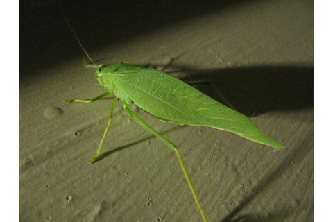 I recognized it right away: a katydid, though that's a fairly generic name. I think that's actually an example of Microcentrum retinerve, or the Lesser Angle-winged Katydid (though it's possibly Microcentrum rhombifolium; it's hard to tell in these pictures*). They're pretty common in North America, though usually not this far west from what I can tell. It was roughly 5 - 7 cm long, and quite pretty. I suspect this one is female because there are no brown spots near the tops of the wings, which males have (I wondered briefly if it may have been a nymph, but this late in the season that seems unlikely). I would've checked for an ovipositor, but c'mon, have some respect. Check out those wings: they look amazingly like plant leaves, which is of course why my wife was so excited. The obvious conclusion is that long ago, the insects like this that had greenish wings with vein-like structures were harder to spot by predatory birds, and were able to pass this characteristic down to their kids (ones that were easier to see got eaten, and didn't get a chance to reproduce as much). Little by little, bit by bit, every time one insect's wings looked a bit more leafy than its siblings it would tend to live longer, and reproduce more. Over thousands, millions, of generations of katydids we get this: an insect that would be incredibly difficult to see from the air. Natural selection at work, my friends. Some people would even call this evolution. I know I would. A very cool thing to see, and a fun example of how wonderful and subtle nature can be. But sometimes subtlety is overrated. Wouldn't it have been cooler to see one like this?