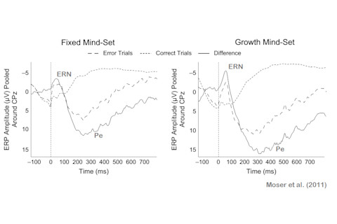 The study Boaler's referring to here was published in 2011 in Psychological Science by Moser et al. of Michigan State University. Boaler refers to this paper in other places as well as this article. But as far as I can see, she is misunderstanding it. Moser et al. used EEG to measure electrical activity in the brain of college students during performance of a simple button-pressing task (nothing to do with mathematics.) It's known that after making an incorrect response, the brain responds with a negative voltage wave, the error-related negativity (ERN), followed by a positive wave, the error-related positivity (Pe). Together these are called the event-related potential (ERP). Moser et al. found that students with a 'growth mindset' showed a larger Pe compared to those with a 'fixed mindset'. Note that on these graphs, negative is up and positive is down: