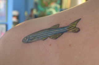 Robin writes, "I recently graduated from Bard College. My senior thesis in biology used zebrafish as a model organism, and in honor of this and the three previous years I spent working with this animal, I got a tattoo of one. He's a male, as one can tell by the all green fins and the slim belly."
