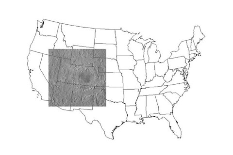 Yowza! Click to get the 1400 x 1400 pixel PNG, or you can try to swallow the 122 Mb TIF at the full resolution of 13,590 x 13,590 pixels! Orientale is a vast impact basin, the hole left by an asteroid that hit the Moon about three billion years ago. Looking like a humongous bulls-eye, it's a multi-ring crater, and the outer ramparts are a full 950 km (590 miles) across. That's half again bigger than my home state of Colorado. To give you an idea of just how big this is -- and also, to be honest, to scare myself a little -- I superimposed the picture of Orientale on a map of the United States. This is to scale, folks: